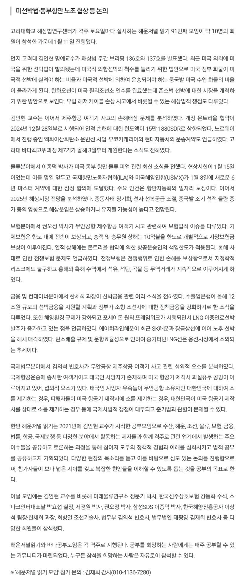 고려대 해운저널읽기 91회차 모임 성료 페이지 정보 작성자 관리자 댓글 0건 조회 1,314회 작성일 25-06-12 10:04 목록 본문 . 관련링크 http://www.maritimepress.co.kr/news/articleView.html?idxno=324118 380회 연결
