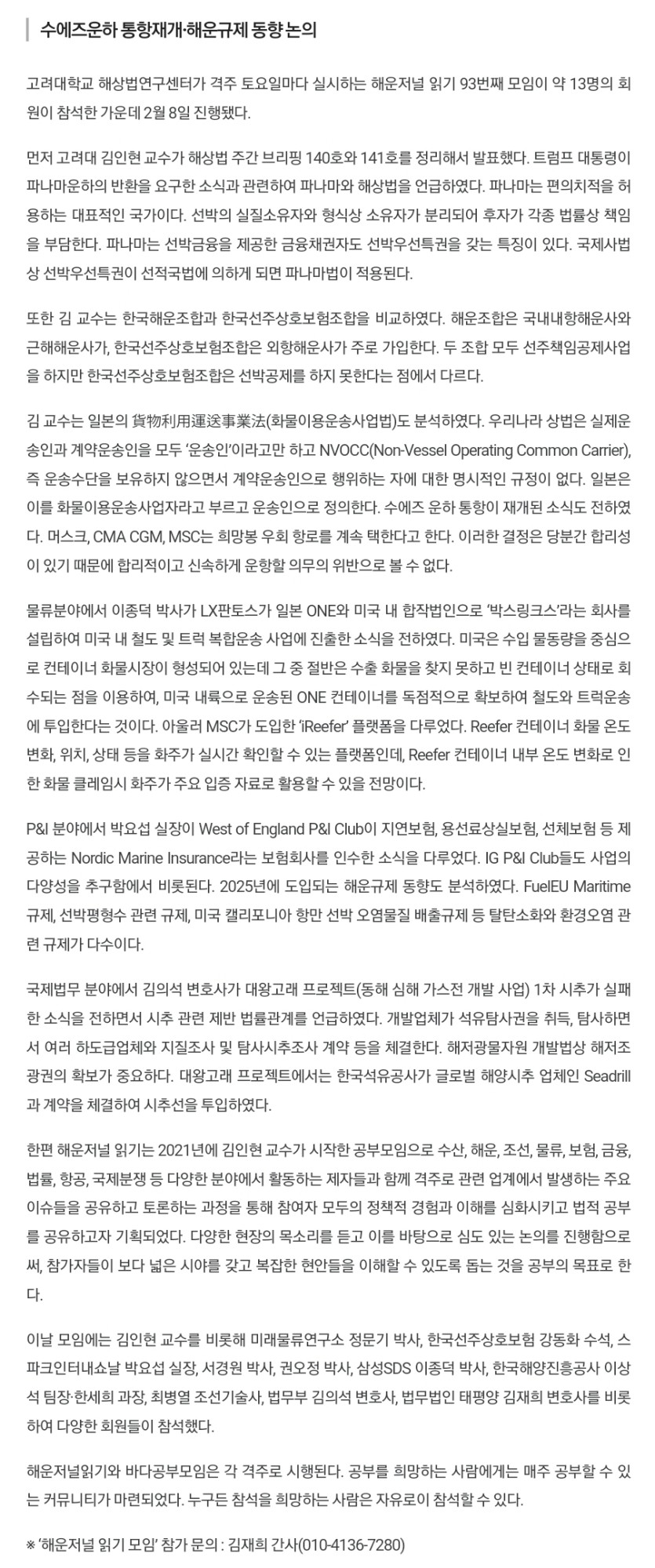 고려대 해운저널읽기 93회차 모임 성료 페이지 정보 작성자 관리자 댓글 0건 조회 1,298회 작성일 25-06-12 10:07 목록 본문 . 관련링크 http://www.maritimepress.co.kr/news/articleView.html?idxno=324463 378회 연결
