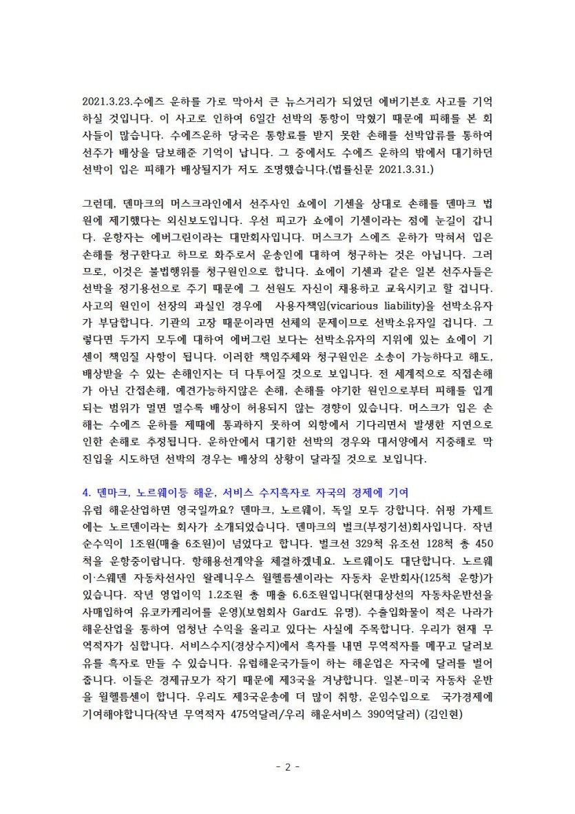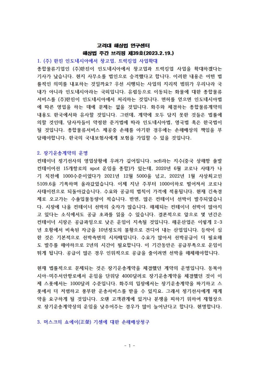 고려대 해상법 주간 브리핑 제39호 페이지 정보 작성자 관리자 댓글 0건 조회 1,949회 작성일 24-07-30 13:35 목록 본문 1. (주) 한진 인도네시아에서 창고업, 트럭킹업 사업확대2. 장기운송계약의 운명3. 머스크의 쇼에이 기센에 대한 손해배상청구4. 덴마크, 노르웨이등 해운, 서비스업