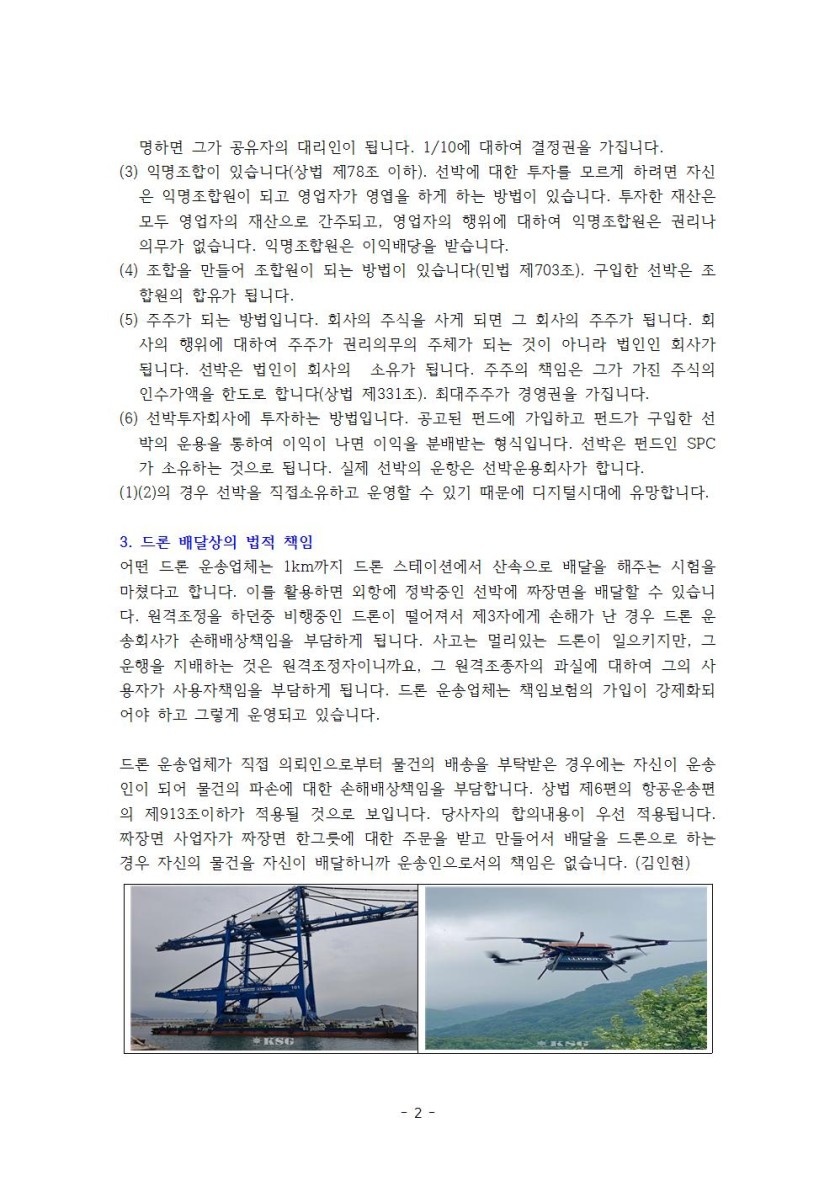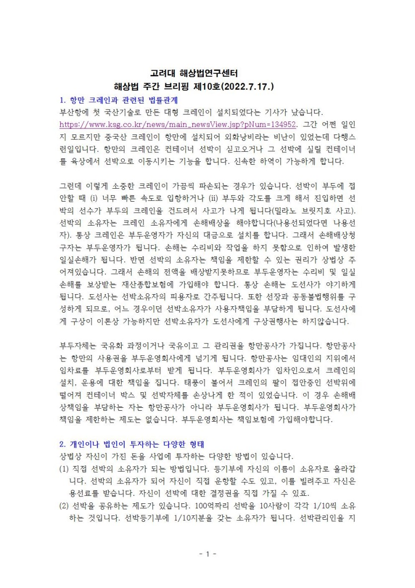 고려대 해상법 주간 브리핑 제10호 페이지 정보 작성자 관리자 댓글 0건 조회 1,843회 작성일 24-07-30 11:20 목록 본문 1. 항만 크레인과 관련된 법률관계2. 개인이나 법인이 투자하는 다양한 형태3. 드론 배달상의 법적 책임