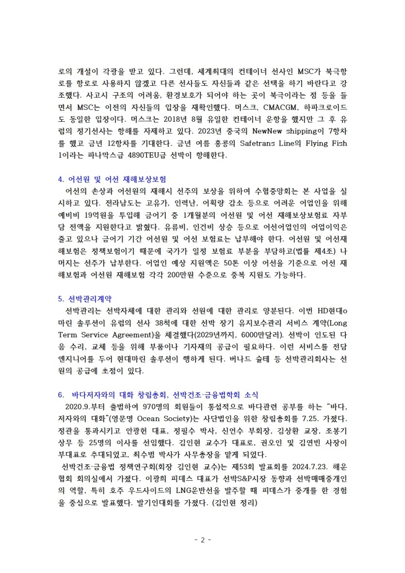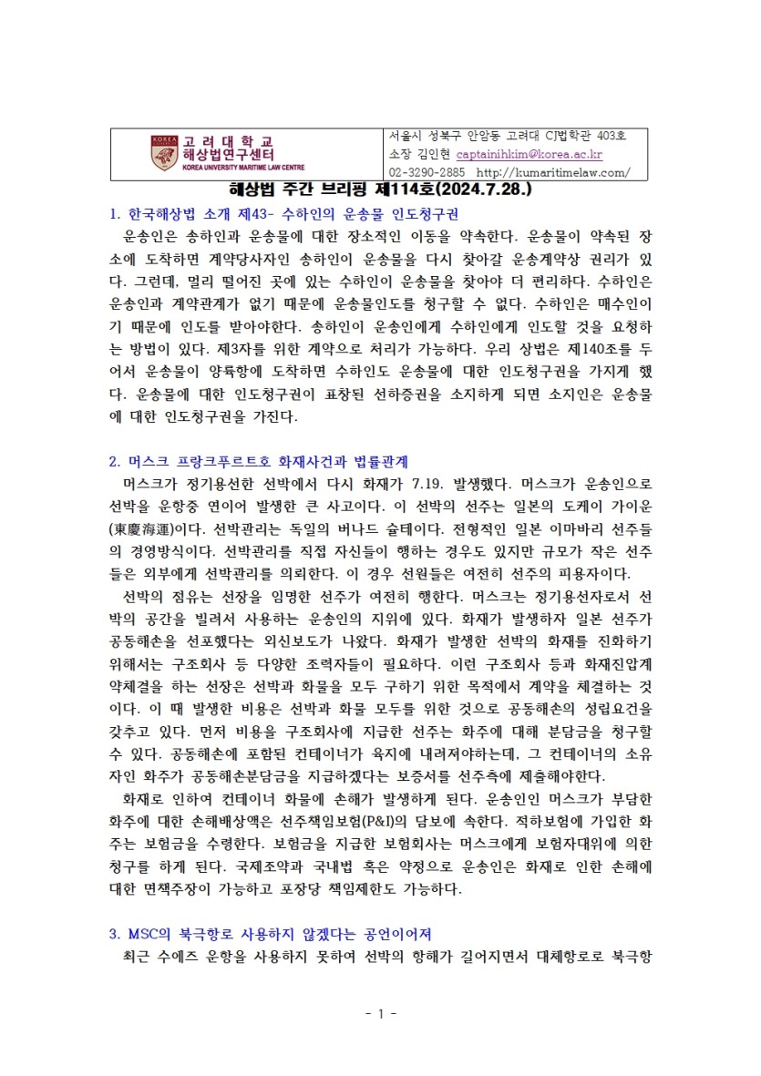 고려대 해상법 주간 브리핑 제114호 페이지 정보 작성자 관리자 댓글 0건 조회 2,228회 작성일 24-07-30 17:06 목록 본문 1. 한국해상법 소개 제43- 수하인의 운송물 인도청구권 2. 머스크 프랑크푸르트호 화재사건과 법률관계 3. MSC의 북극항로 사용하지 않겠다는 공언이어져4. 어선원 및 어선 재해보상보험5. 선박관리계약6. 바다저자와의 대화 창립총회, 선박건조·금융법학회 소식