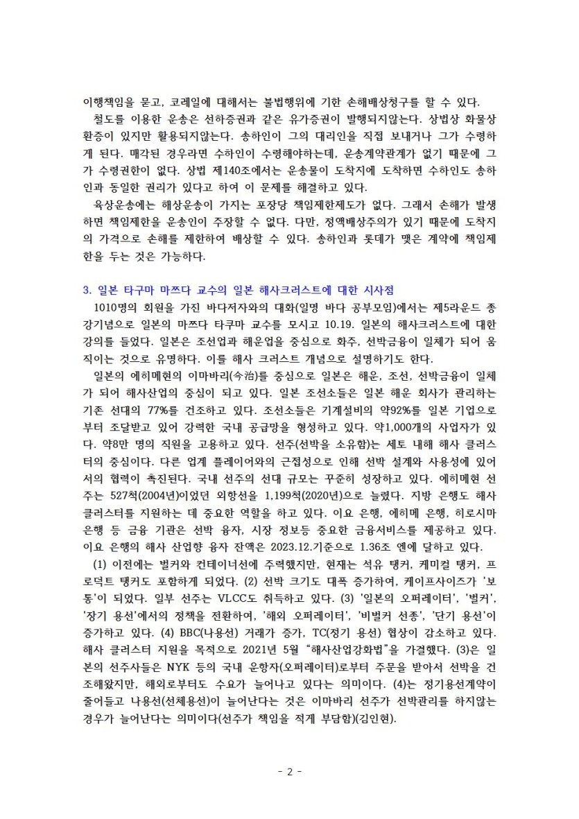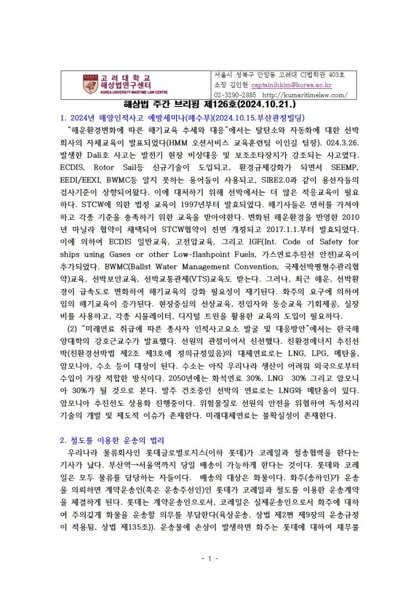 고려대 해상법 주간 브리핑 제126호(2024.10.21.) 페이지 정보 작성자 관리자 댓글 0건 조회 2,069회 작성일 24-10-21 12:05 목록 본문 제126호에는1. 해양사고에방세미나 참석 결과보고 2. 철도운송의 법리3. 일본 교수의 해사클러스트에 대한 발표요약 입니다,