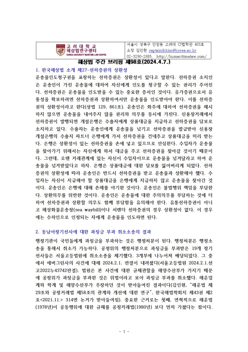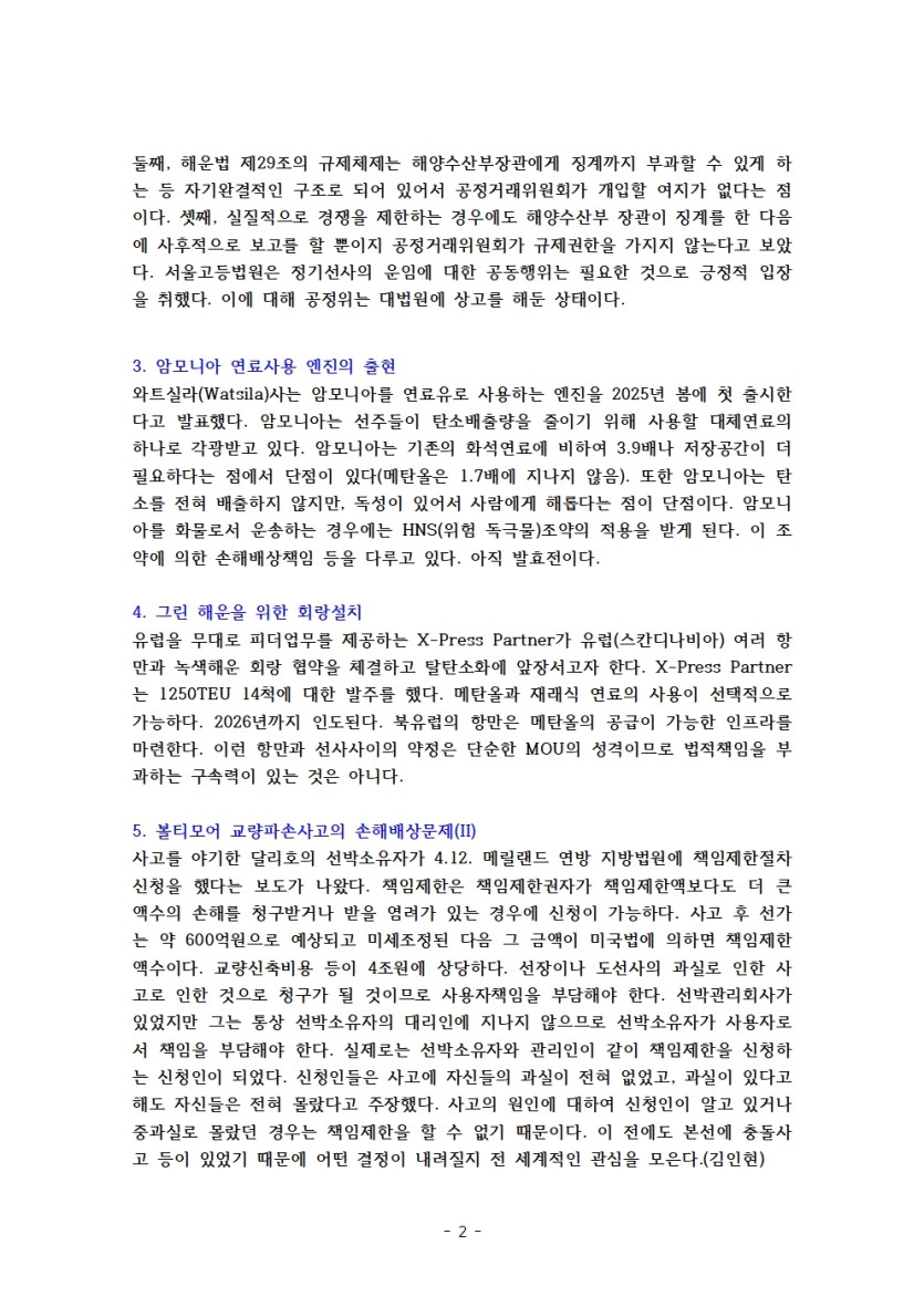 고려대 해상법 주간 브리핑 제98호 페이지 정보 작성자 관리자 댓글 0건 조회 2,082회 작성일 24-07-30 16:41 목록 본문 1. 한국해상법 소개 제27-선하증권의 상환성2. 동남아정기선사에 대한 과징금 부과 취소소송의 결과3. 암모니아 연료사용 엔진의 출현4. 그린 해운을 위한 회랑설치5. 볼티모어 교량파손사고의 손해배상문제(II)