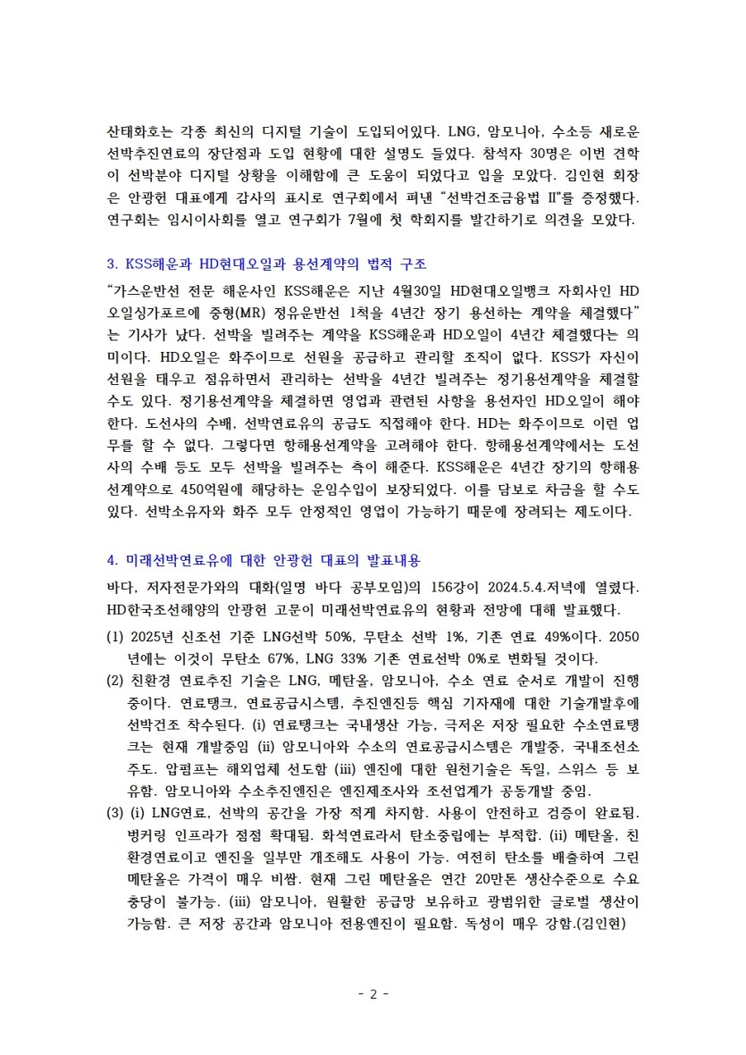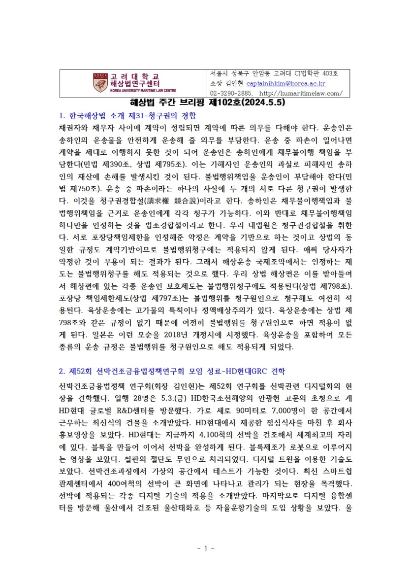 고려대 해상법 주간 브리핑 제102호 페이지 정보 작성자 관리자 댓글 0건 조회 2,042회 작성일 24-07-30 16:45 목록 본문 1. 한국해상법 소개 제31-청구권의 경합2. 제52회 선박건조금융법정책연구회 모임 성료-HD현대GRC 견학3. KSS해운과 HD현대오일과 용선계약의 법적 구조4. 미래선박연료유에 대한 안광헌 대표의 발표내용