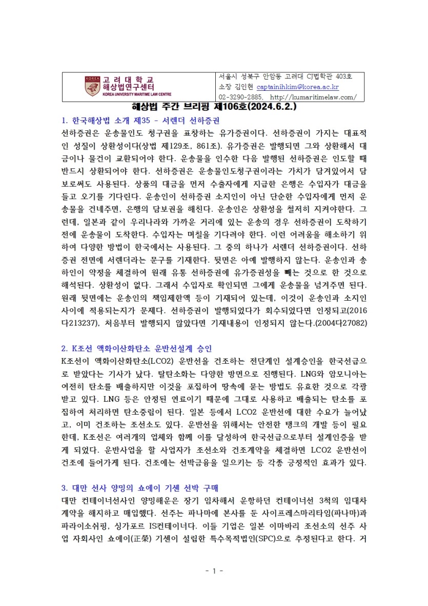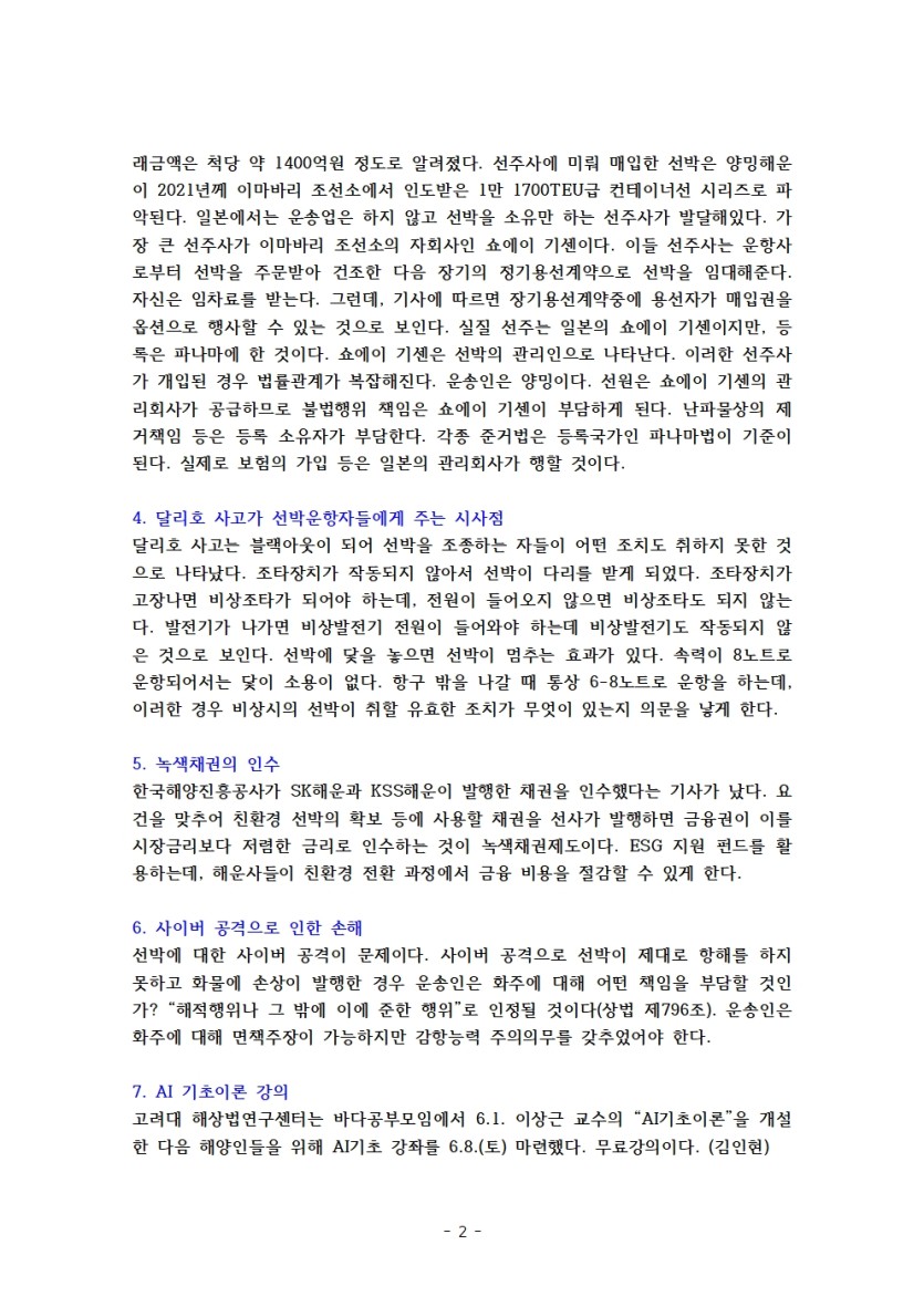 고려대 해상법 주간 브리핑 제106호 페이지 정보 작성자 관리자 댓글 0건 조회 2,304회 작성일 24-07-30 16:49 목록 본문 1. 한국해상법 소개 제35 - 서렌더 선하증권2. K조선 액화이산화탄소 운반선설계 승인3. 대만 선사 양밍의 쇼에이 기센 선박 구매4. 달리호 사고가 선박운항자들에게 주는 시사점5. 녹색채권의 인수6. 사이버 공격으로 인한 손해7. AI 기초이론 강의