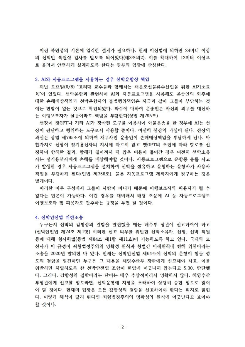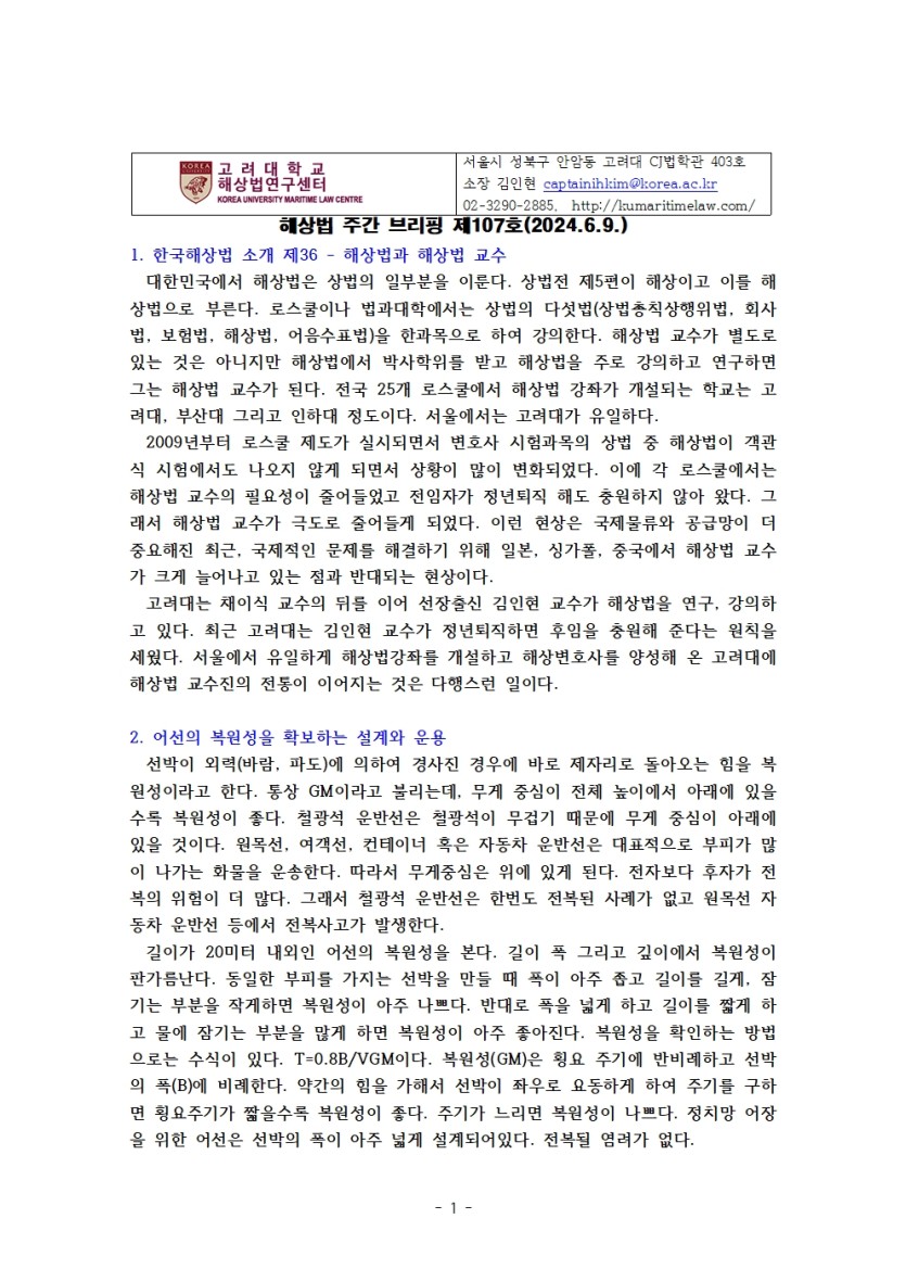 고려대 해상법 주간 브리핑 제107호 페이지 정보 작성자 관리자 댓글 0건 조회 2,051회 작성일 24-07-30 16:50 목록 본문 1. 한국해상법 소개 제36 - 해상법과 해상법 교수2. 어선의 복원성을 확보하는 설계와 운용3. AI와 자동프로그램을 사용하는 경우 선박운항상 책임4. 선박안전법 위헌소송