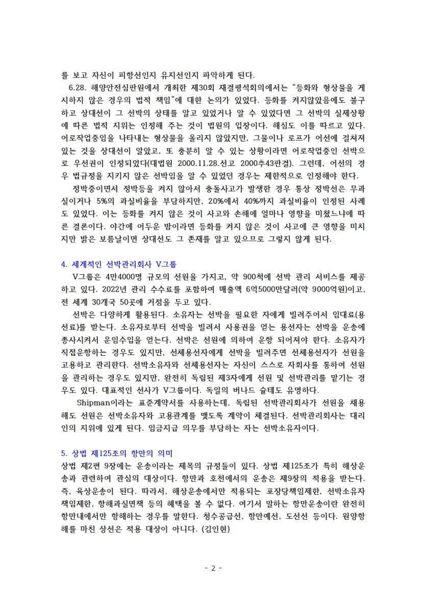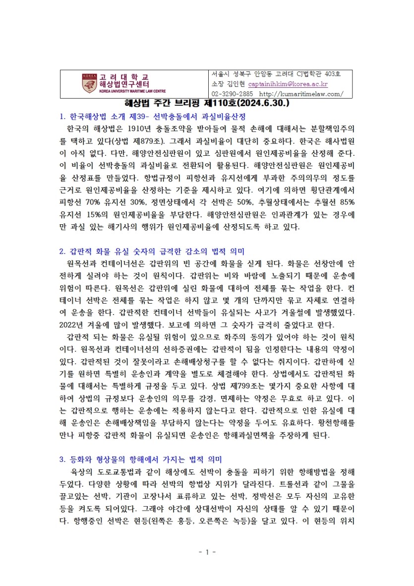 고려대 해상법 주간 브리핑 제110호 페이지 정보 작성자 관리자 댓글 0건 조회 2,116회 작성일 24-07-30 16:53 목록 본문 1. 한국해상법 소개 제39-선박충돌에서 과실비율 산정2. 갑판적 화물 유실 숫자의 급격한 감소의 법적 의미3. 등화와 형상물의 항해에서 가지는 법적 의미4. 세계적인 선박관리회사 V그룹5. 상법 제125조의 항만의 의미
