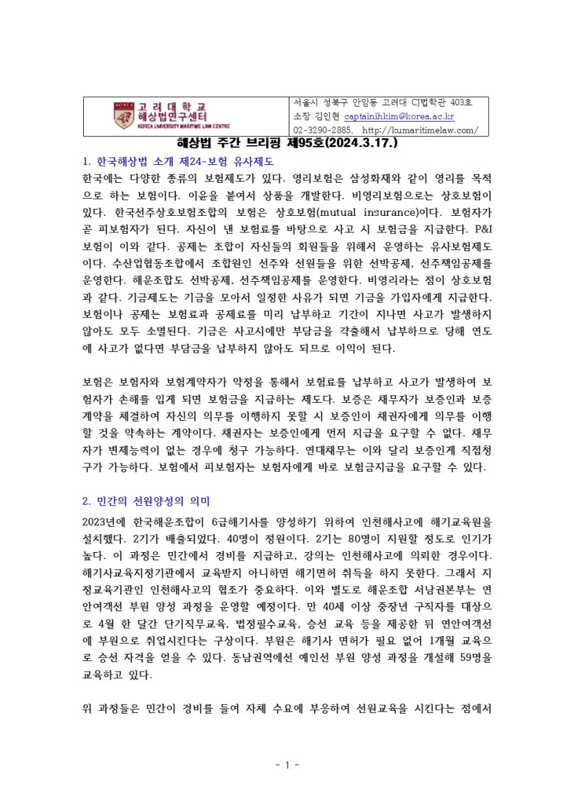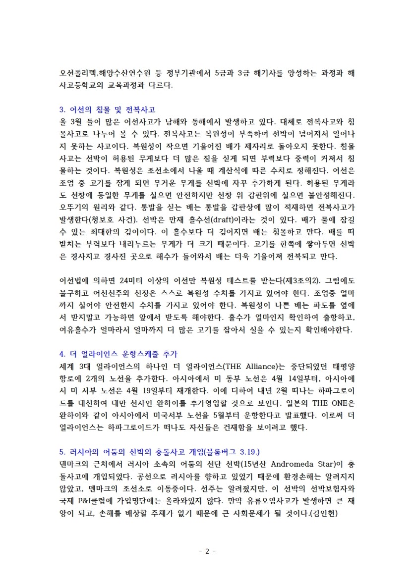 고려대 해상법 주간 브리핑 제95호 페이지 정보 작성자 관리자 댓글 0건 조회 2,142회 작성일 24-07-30 16:39 목록 본문 1. 한국해상법 소개 제24-보험 유사제도2. 민간의 선원양성의 의미3. 어선의 침몰 및 전복사고4. 더 얼라이언스 운항스케줄 추가5. 러시아의 어둠의 선박의 충돌사고 개입(블룸버그 3.19.)