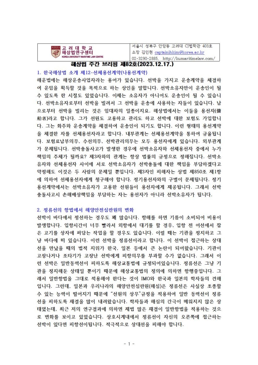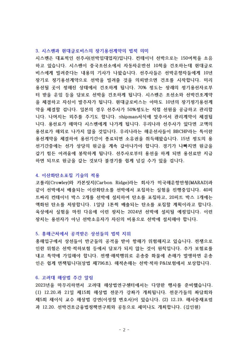 고려대 해상법 주간 브리핑 제82호 페이지 정보 작성자 관리자 댓글 0건 조회 2,232회 작성일 24-07-30 15:59 목록 본문 1. 한국해상법 소개 제12-선체용선계약(나용선계약)2. 정류선의 항법에서 해양안전심판원의 변화3. 시스팬과 현대글로비스의 장기용선계약의 법적 의미4. 이산화탄소포집 기술의 적용5. 홍해근처에서 공격받은 상선들의 법적 지위6. 고려대 해상법 주간 알림