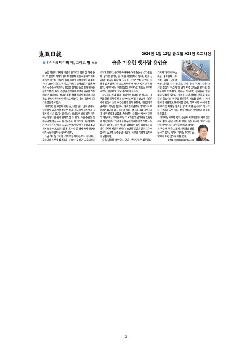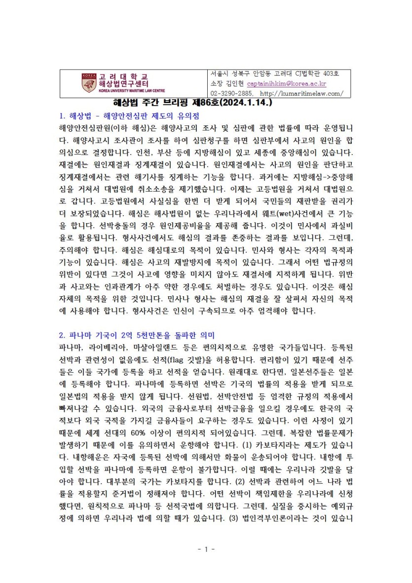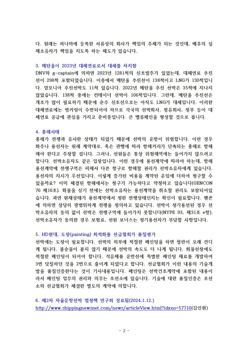 고려대 해상법 주간 브리핑 제86호 페이지 정보 작성자 관리자 댓글 0건 조회 2,128회 작성일 24-07-30 16:30 목록 본문 1. 해상법 - 해양안전심판 제도의 유의점2. 파나마 기국이 2억 5천만톤을 돌파한 의미3. 메탄올이 2023년 대체연료로서 대세를 차지함4. 홍해사태5. HD현대, 도장(painting) 최적화를 선급협회가 품질평가6. 제2차 자율운항선박 법정책 연구회 성료됨(2024.1.12.)