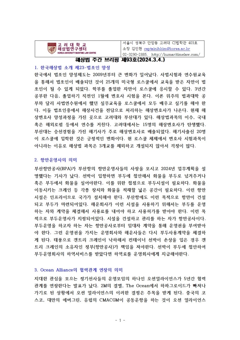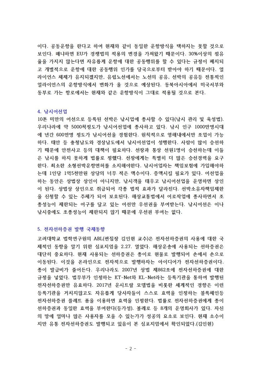 고려대 해상법 주간 브리핑 제93호 페이지 정보 작성자 관리자 댓글 0건 조회 1,914회 작성일 24-07-30 16:37 목록 본문 1. 한국해상법 소개 제23-법조인 양성2. 항만운영사의 의미3. Ocean Alliance의 협력관계 연장의 의미4. 낚시어선업5. 전자선하증권 발행 국제동향