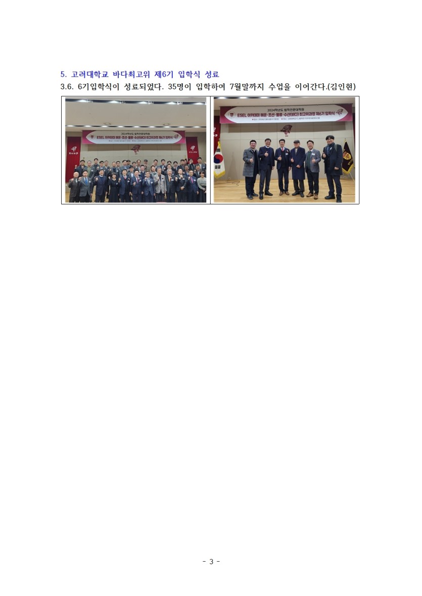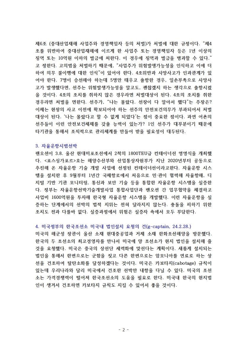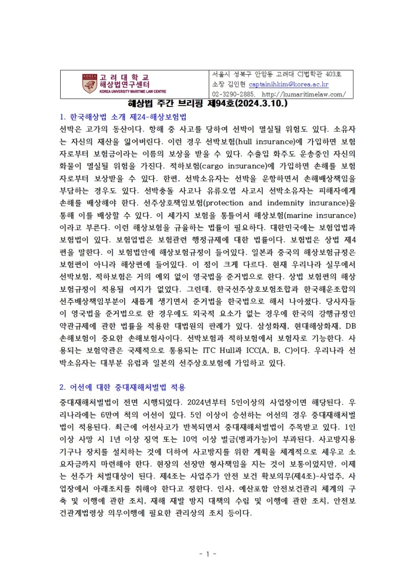 고려대 해상법 주간 브리핑 제94호 페이지 정보 작성자 관리자 댓글 0건 조회 2,144회 작성일 24-07-30 16:38 목록 본문 1. 한국해상법 소개 제24-해상보험법2. 어선에 대한 중대재해처벌법 적용3. 자율운항시범선박4. 미국정부의 한국조선소 미국내 법인설치 요청의 건(g-captain, 24.2.28.)5. 고려대학교 바다최고위 제6기 입학식 성료
