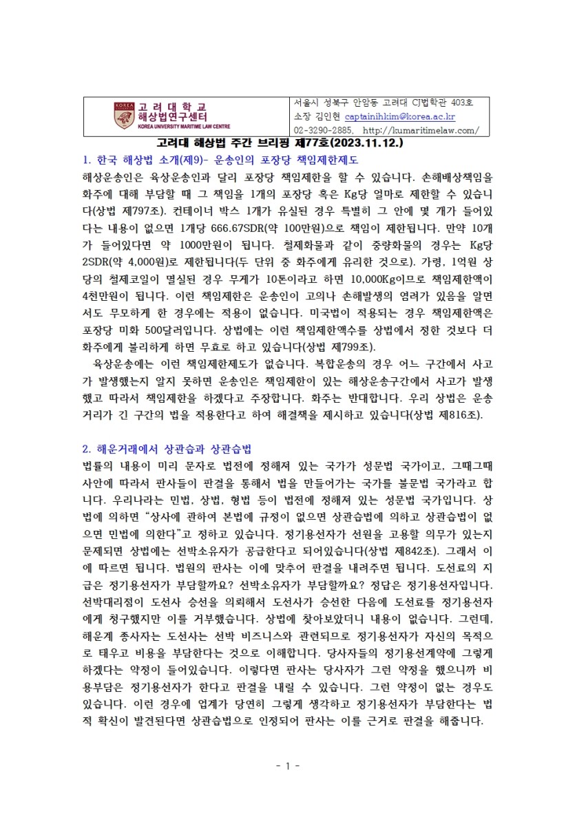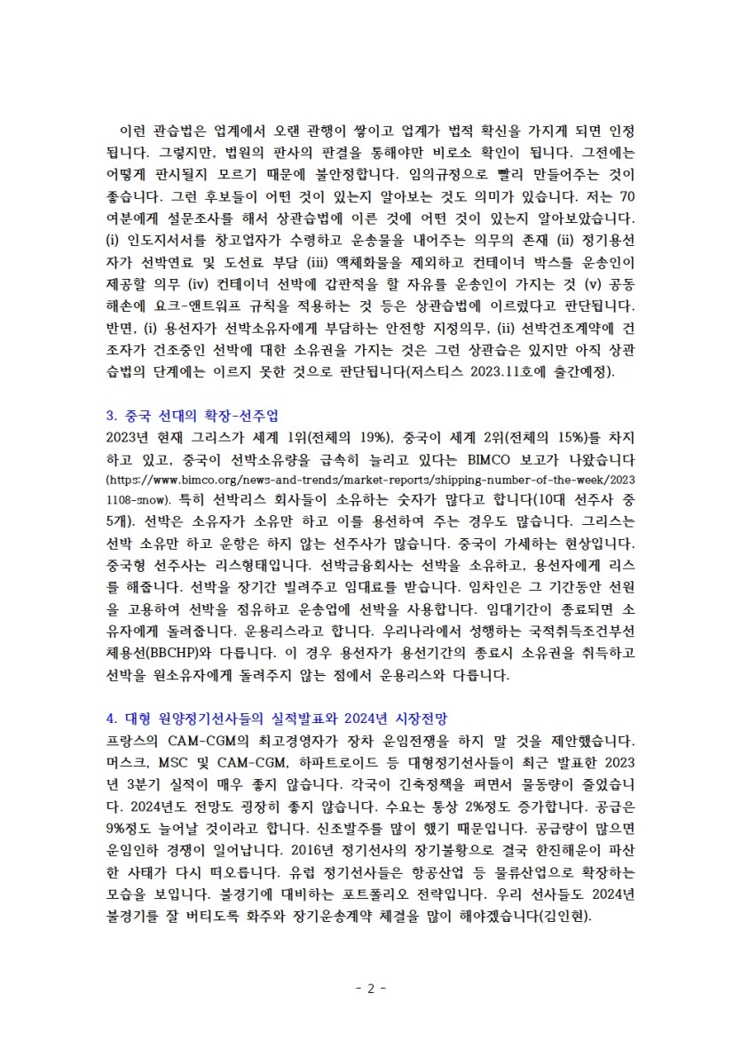 고려대 해상법 주간 브리핑 제77호 페이지 정보 작성자 관리자 댓글 0건 조회 1,993회 작성일 24-07-30 15:55 목록 본문 1. 한국 해상법 소개(제9)- 운송인의 포장당 책임제한제도2. 해운거래에서 상관습과 상관습법3. 중국 선대의 확장-선주업4. 대형 원양정기선사들의 실적발표와 2024년 시장전망