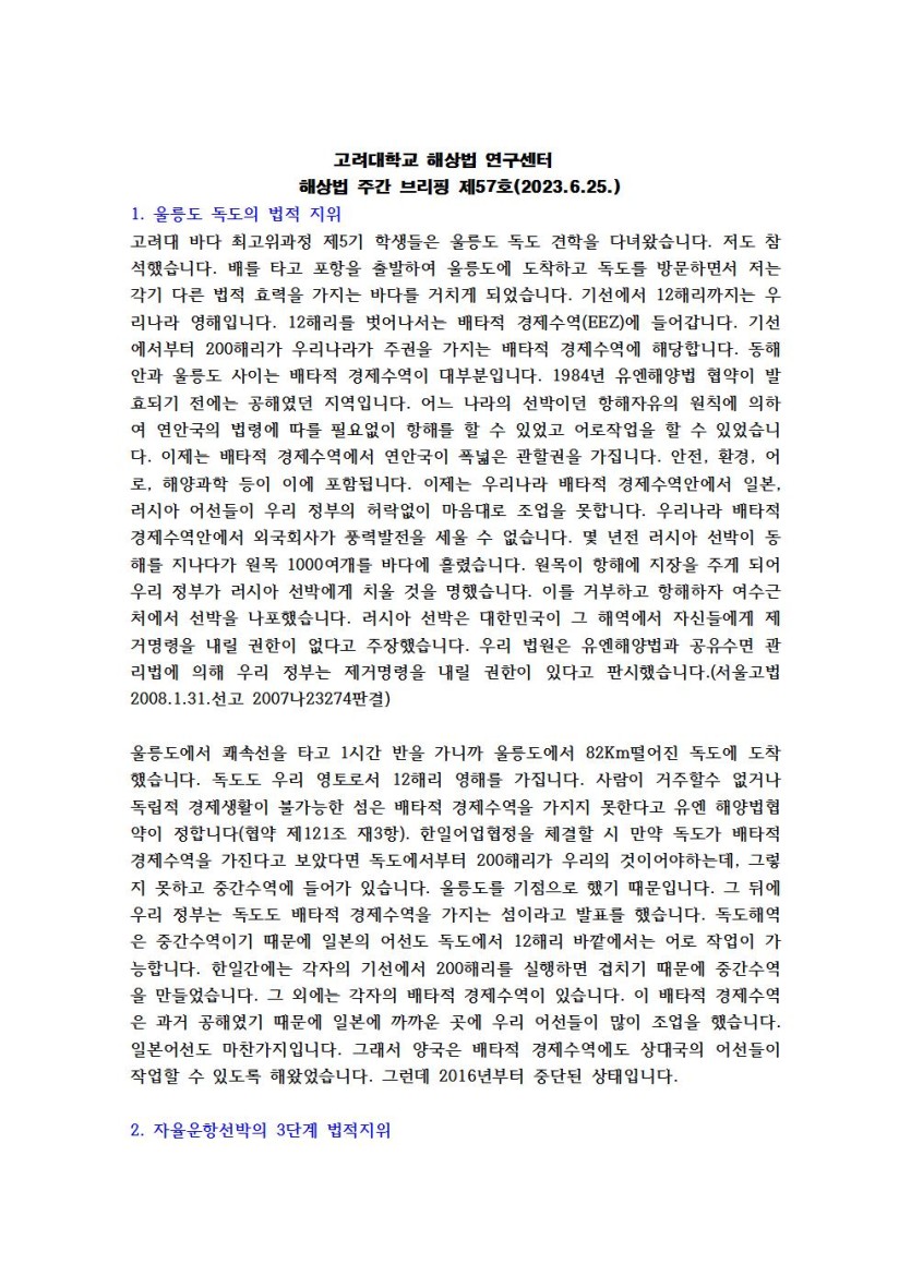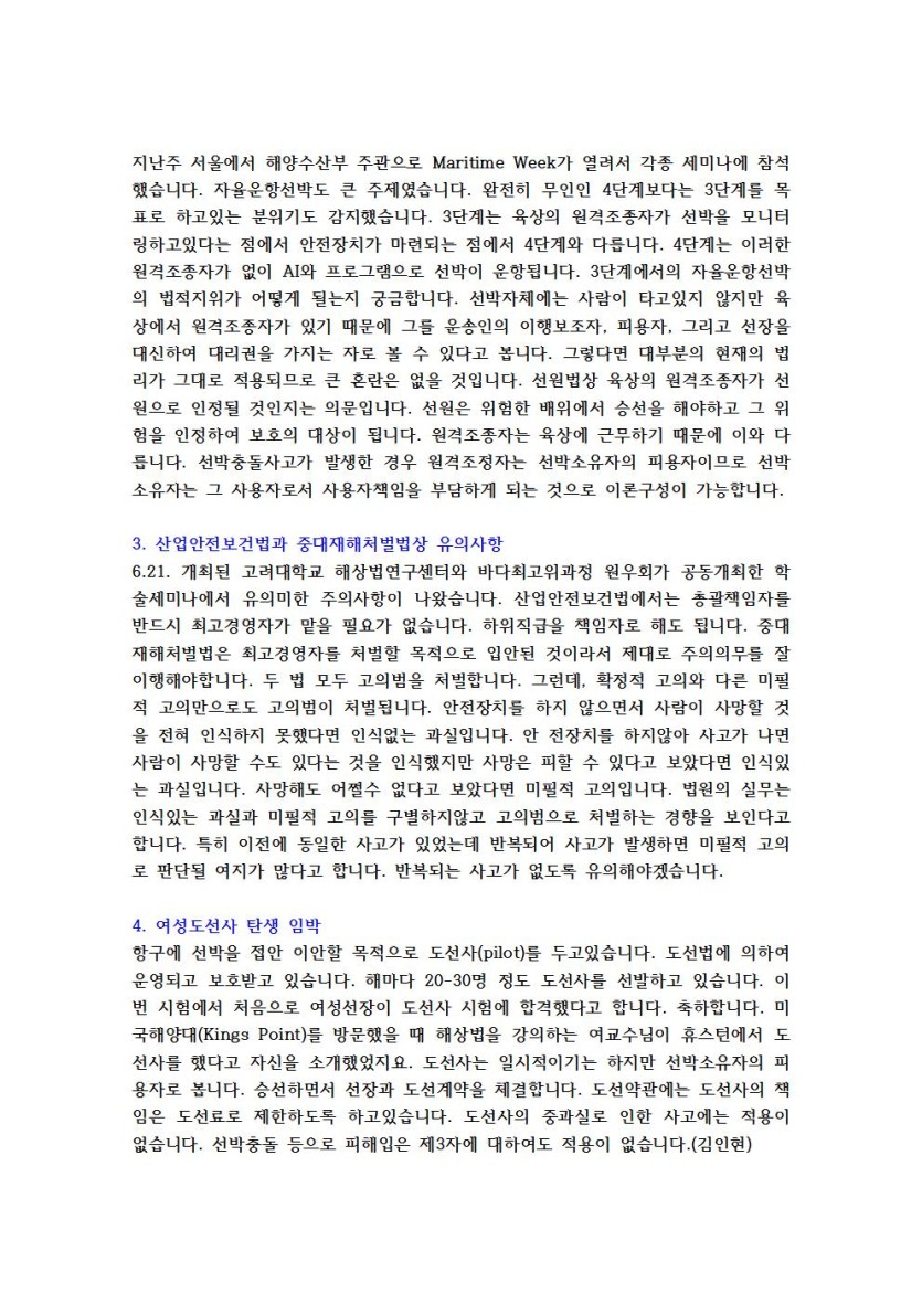 고려대 해상법 주간 브리핑 제57호 페이지 정보 작성자 관리자 댓글 0건 조회 2,116회 작성일 24-07-30 15:30 목록 본문 1. 독도의 법적 지위2. 자율운항 선박 제3단계3. 산업안전보건법4. 여성 도선사의 탄생