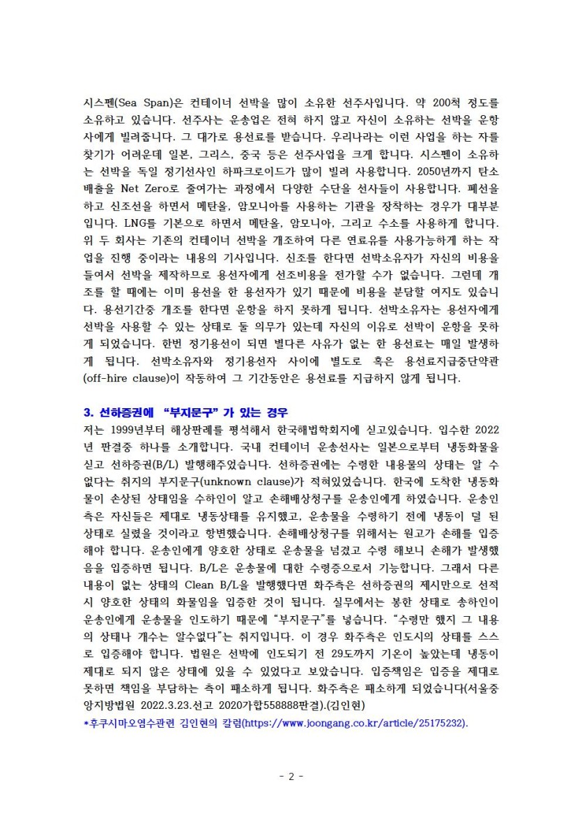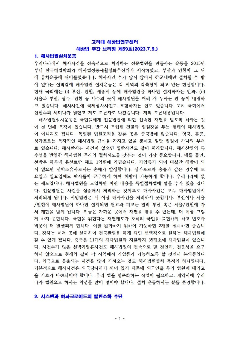 고려대 해상법 주간 브리핑 제59호 페이지 정보 작성자 관리자 댓글 0건 조회 1,873회 작성일 24-07-30 15:33 목록 본문 1. 해사법원 설치 운동2. 시스펜이 선박 연료류를 위한 기관 개조3. 선하증권상 부지문구의 효력* 중앙일보 후쿠시마 오염수 방류 관련 김인현 칼럼