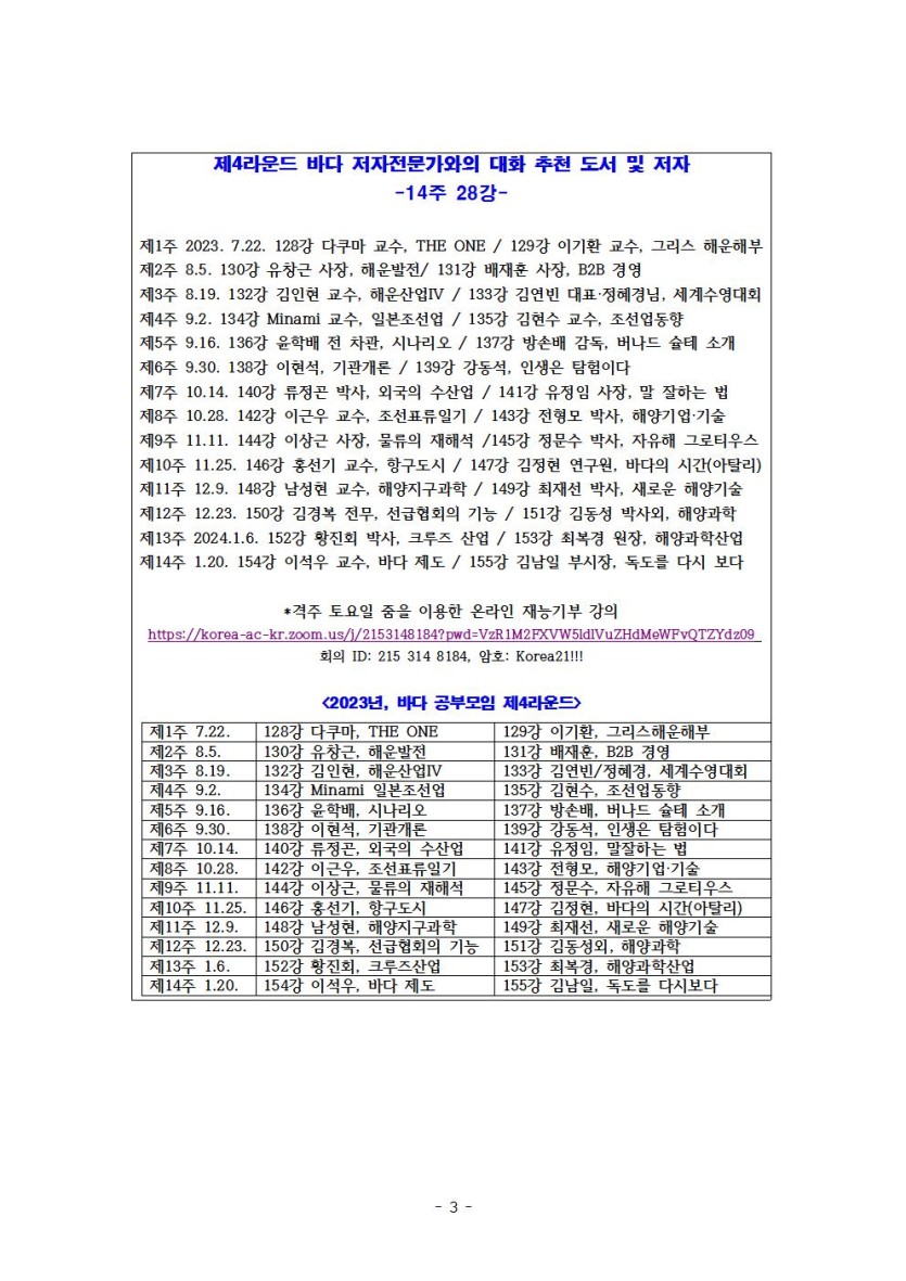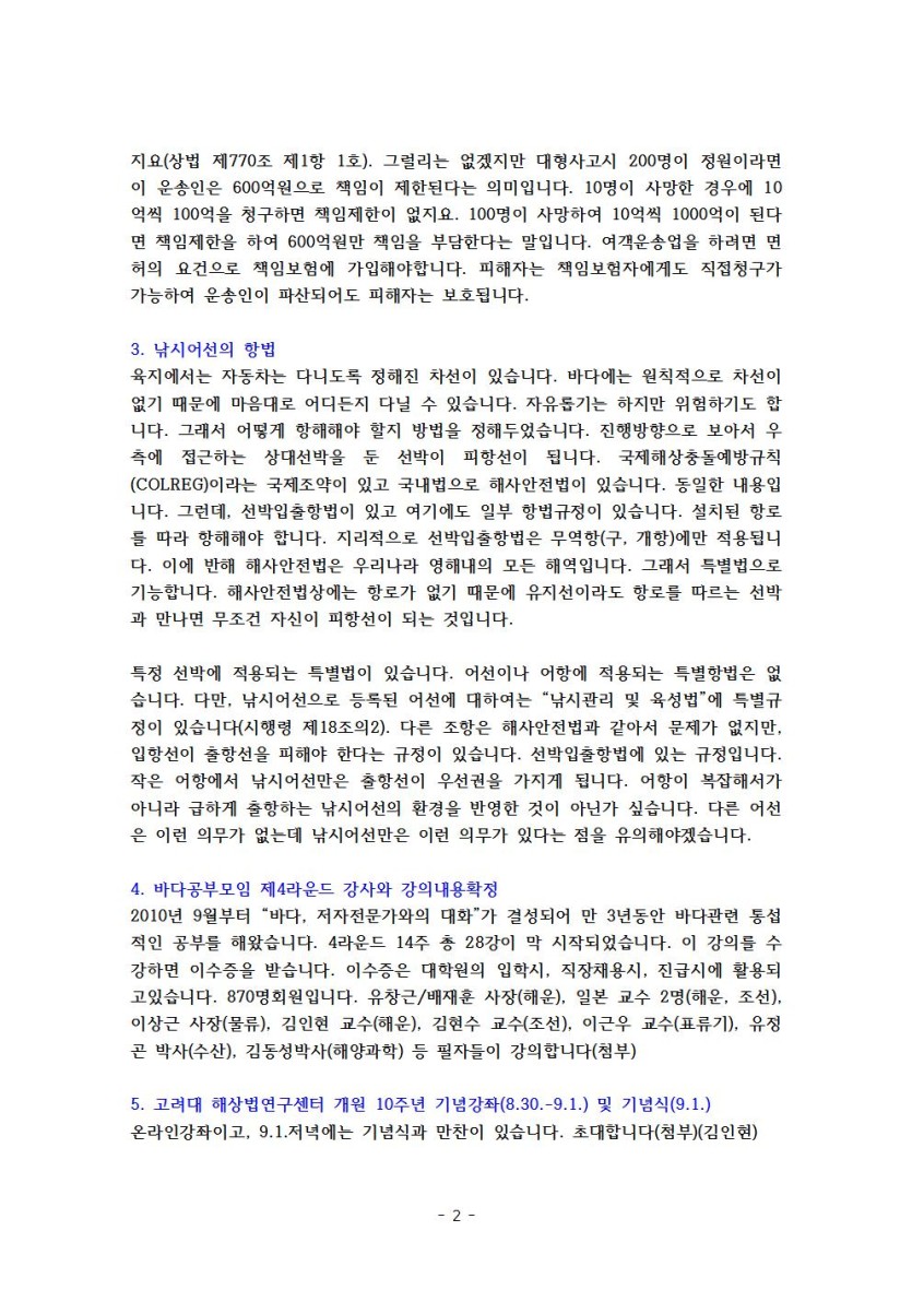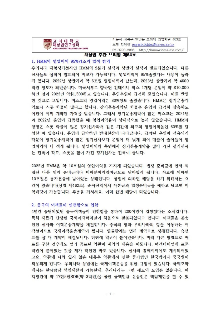 고려대 해상법 주간 브리핑 제64호 페이지 정보 작성자 관리자 댓글 0건 조회 2,143회 작성일 24-07-30 15:41 목록 본문 1. HMM의 영업이익 95% 감소의 법적 함의2. 중국의 여객들이 인천항으로 입항3. 낚시어선의 항법4. 바다공부모임 제4라운드 강사와 강의내용확정5. 고려대 해상법연구센터 개원 10주년 기념강좌 및 기념식