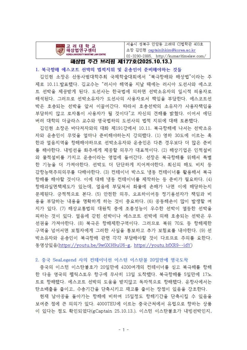 고려대 해상법 주간 브리핑 제177호(2025.10.13.)