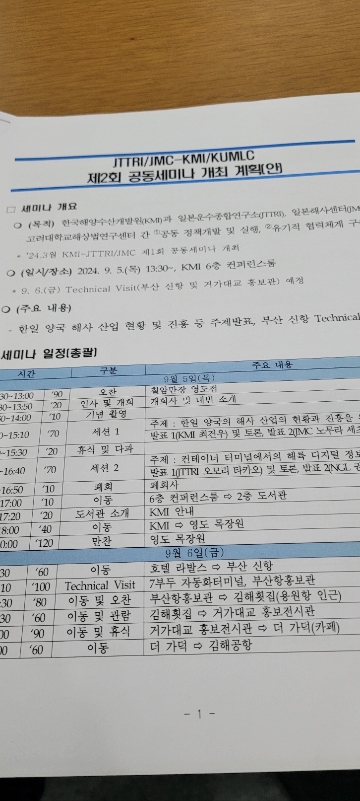 KMI, 고려대 해상법연구센터, 일본해사센터, 일본운수종합연구소와 제2회 세미나 개최 페이지 정보 작성자 관리자 댓글 0건 조회 1,267회 작성일 24-09-18 04:13 목록 본문 고려대 해상법연구센터는 협정을 체결한 kMI, 일본해사센터, 일본운수종합연구소와 제2회 세미나를 개최했습니다.김인현 소장이 참석했습니다. 2024.9.5. KMI